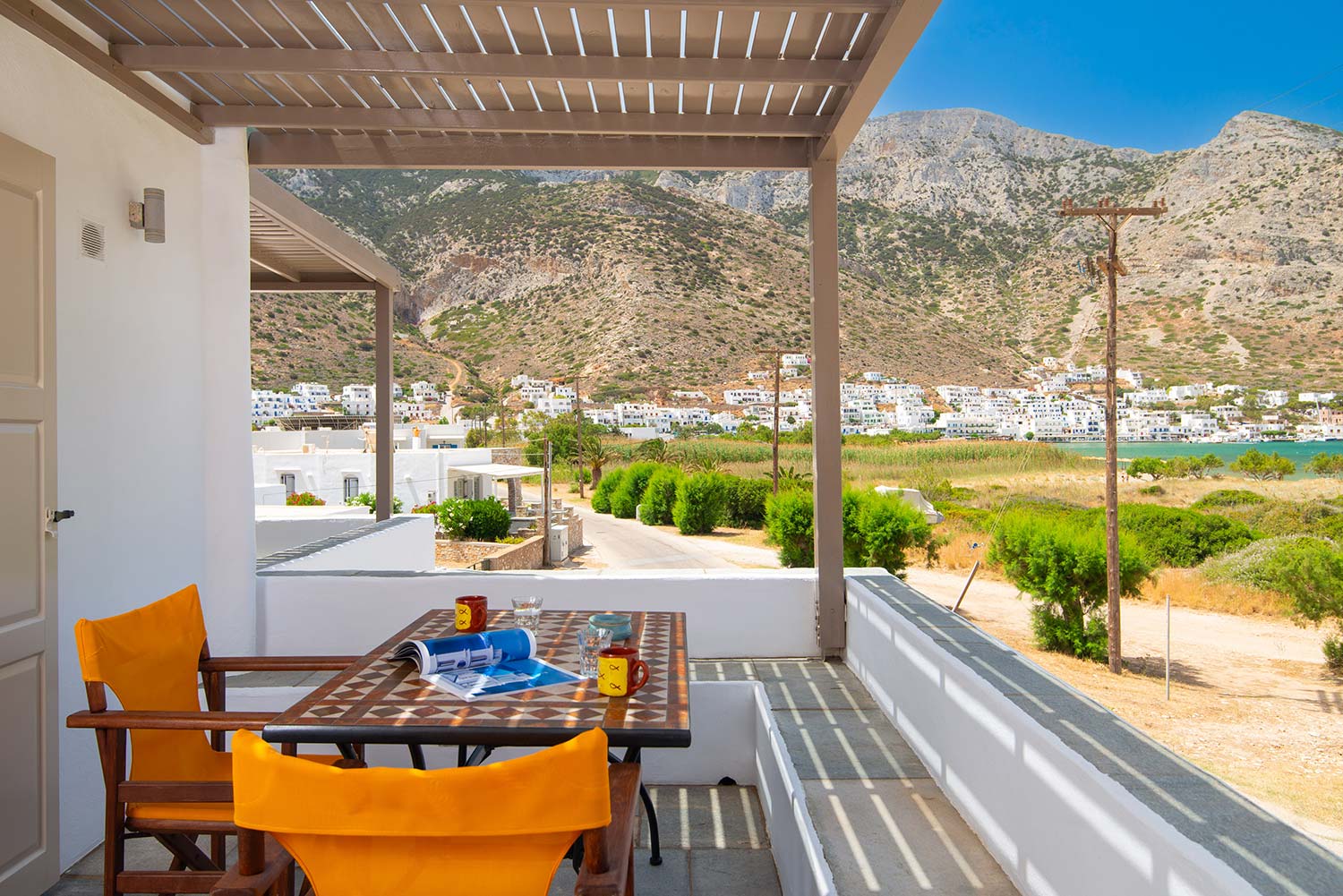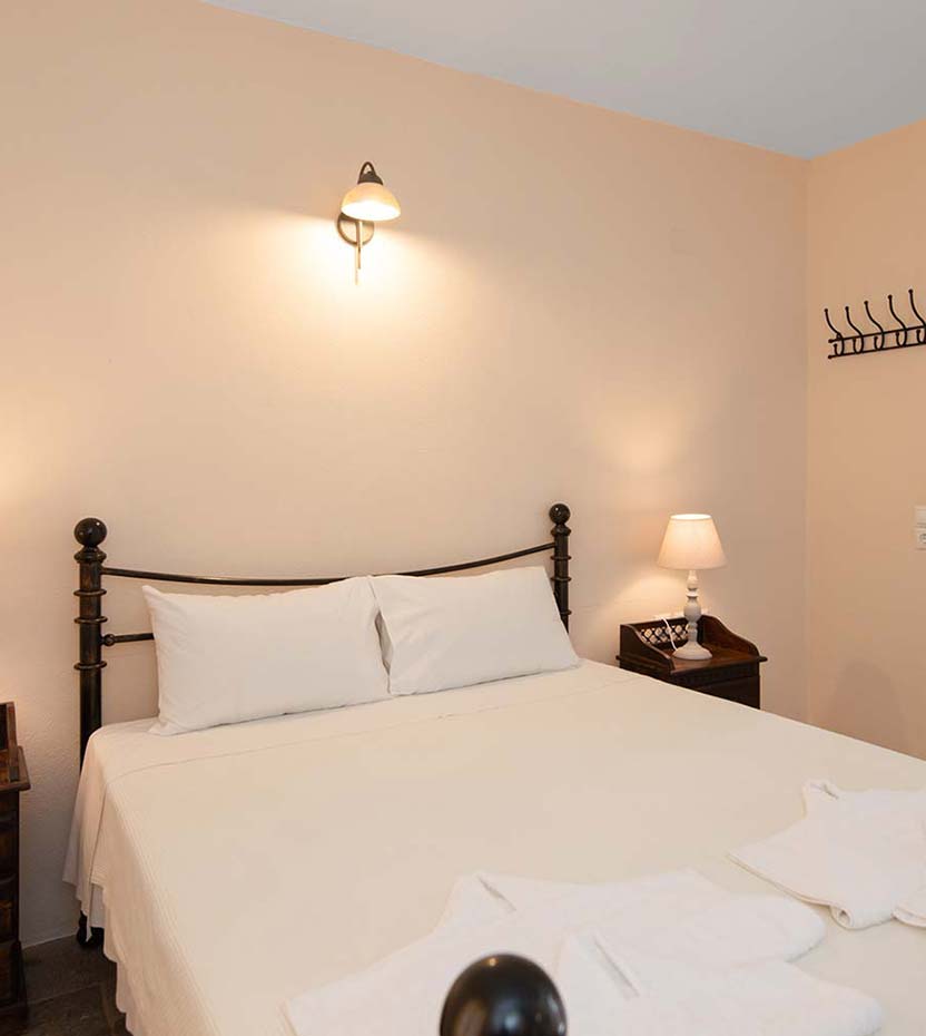Apartment 2, also located on the first floor, features a stunning sea view, offering a perfectly relaxing stay. The apartment is fully equipped with a kitchen that includes all necessary appliances for meal preparation, as well as a spacious living room with traditional décor and bright colors that create a warm ambiance. The comfortable bedroom with its iron bed provides the perfect sense of calm and comfort. The modern bathroom complements the Cycladic aesthetic with its minimal décor. On the balcony, guests can enjoy the unobstructed view of the Aegean Sea.