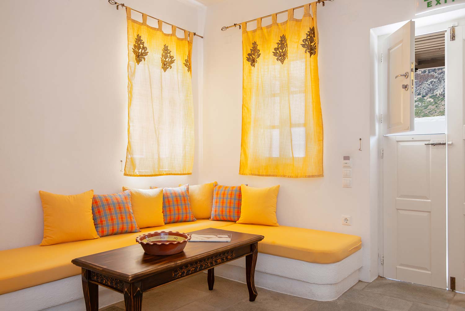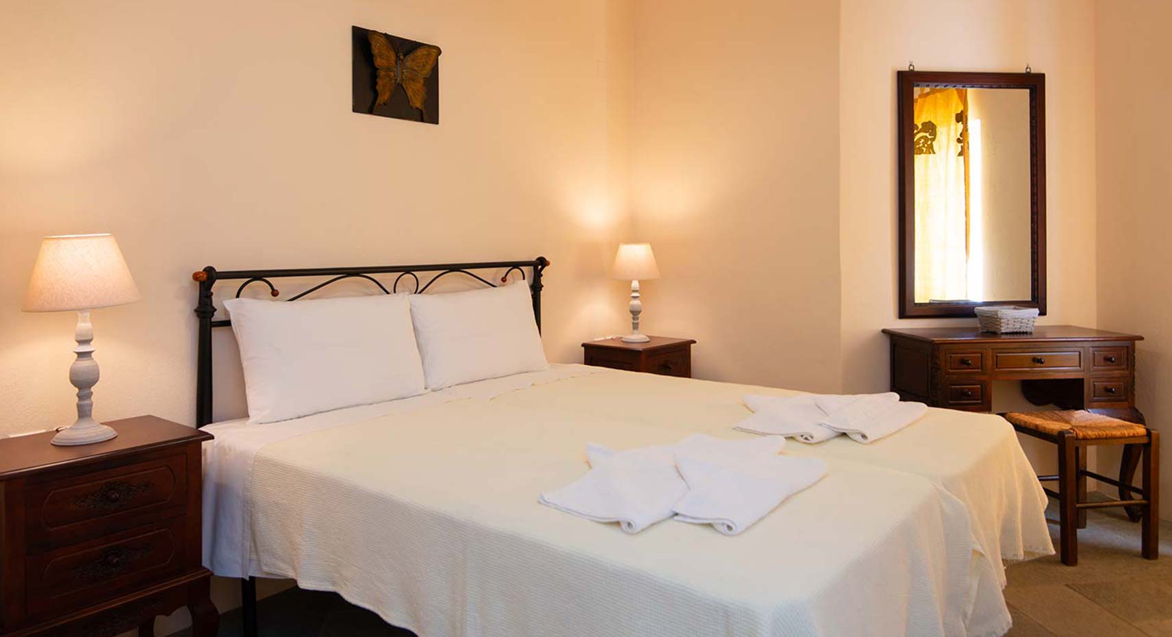 Apartment 3 is a great option for those who prefer being on the ground floor, offering direct access to the outdoor area and a terrace with a sea view. It includes a fully equipped kitchenette for meal preparation and a spacious bedroom with a comfortable bed. The traditional design, with bright tones and classic décor, provides a warm atmosphere. The modern bathroom offers comfort, while the exterior terrace is perfect for relaxing moments with views of the blue horizon.